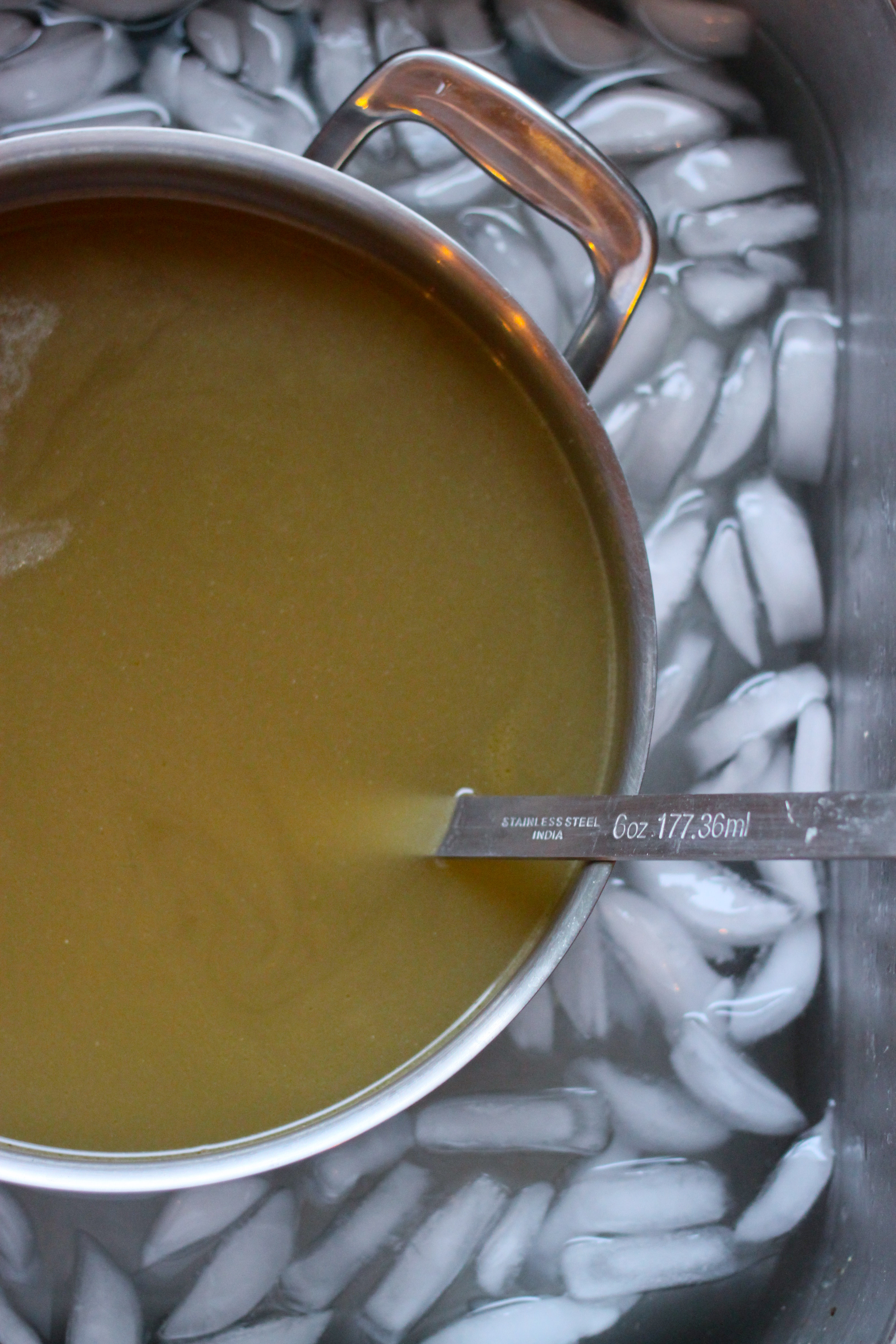 Now we want to get this stock cooled down as quickly as possible. Remember the discussion about all the nutrients and proteins in stock, and how it’s great for you when you are sick? Well unfortunately, bacteria love stock too. Think of it this way, chicken stock is incredibly similar to the liquid that scientists use to grow bacteria in a lab, and bacteria grow really well in it! I don’t want to scare you away: stock can probably be left to cool at room temperature, as long as you separate it into smaller containers, and the cooling doesn’t take more than a few hours*. I like to be safe, rather than sorry, since I don’t know where this stock is going to be used, and I don’t want to run the risk of making anyone sick, especially Logan. I’ve found that the quickest way to cool a bunch of stock is to put the entire pot in a sink full of ice water, and stir both the stock and the surrounding ice water. Convection in the water and stock (a.k.a. movement) will result in a much more rapid cooling than if you simply left it alone.