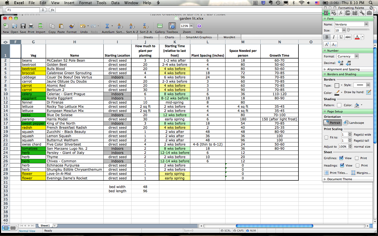 To organize the information I’d gathered about these seeds, I created a spreadsheet to compile the necessary information about each plant. This included planting time relative to the last frost, spacing, time until harvest, etc..