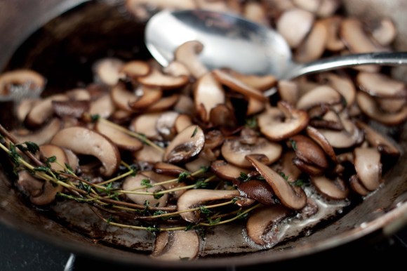 For those raviolis you’re going to eat right away, bring a pot of salted water to a boil. Slice the caps of 1 cup mushrooms; I used plain brown mushrooms, but use whatever you like best. Put a pan over medium heat and dump the mushroom in, along with a pinch of salt. Cook the mushrooms until they start to give up a lot of their liquid. Remove the excess liquid, add 1 Tbsp butter and some sprigs of thyme, and cook over high heat until the mushrooms start to turn golden brown (not just cooked-mushroom brown). When your water is boiling, throw in some ravioli and cook for a couple minutes. The filling is already cooked, so we only need to cook the pasta and warm the filling. When the ravioli are cooked, remove from the water with a spider strainer, and drain in a colander. The finish the dish, move your ravioli to a warm plate, drizzle your favorite olive oil on top, and add some golden-brown mushroom slices. I also like to shave some parmesan cheese over it, along with a sprinkle of fresh thyme leaves and lemon zest, to brighten the flavors of the earthy mushrooms.