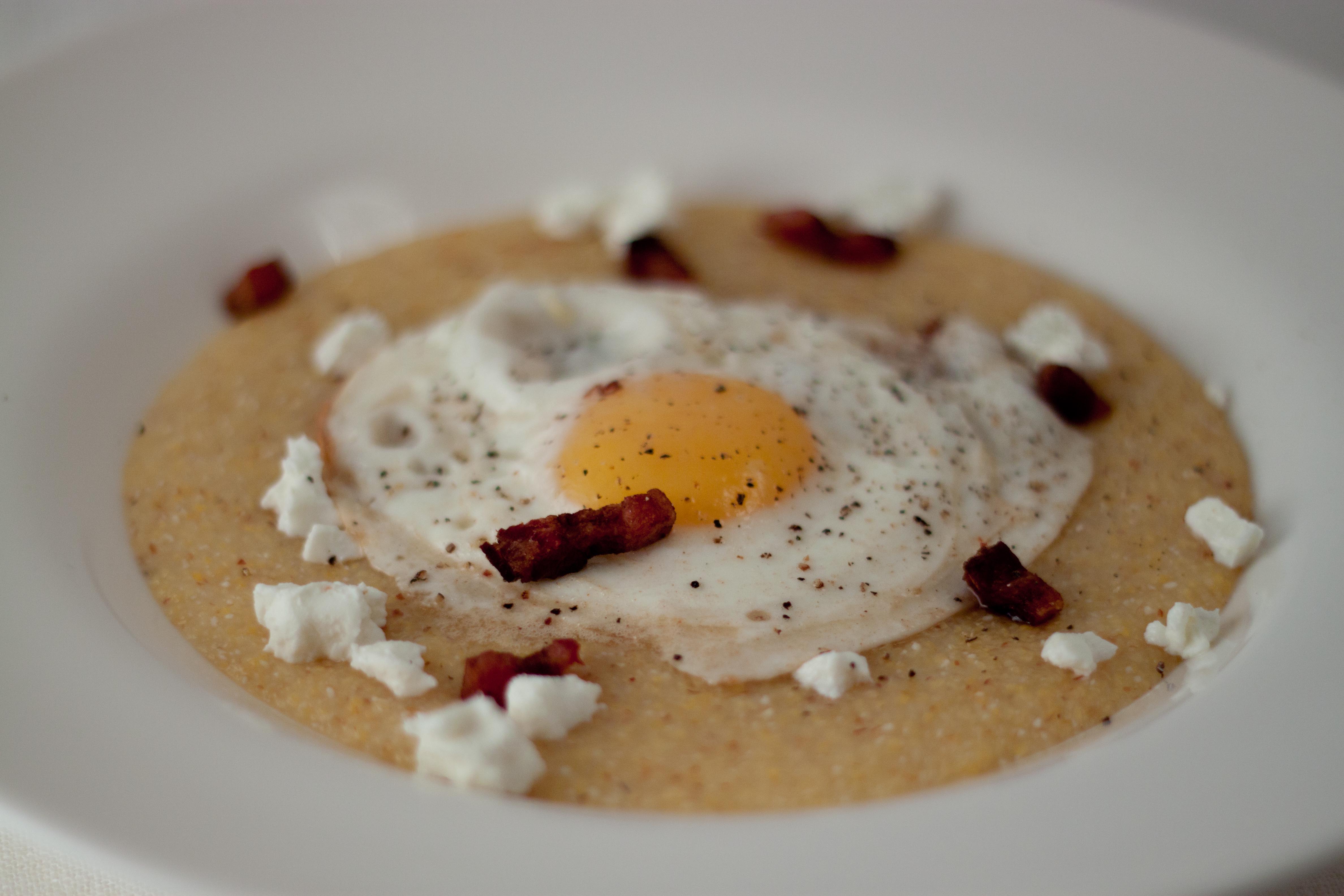 Polenta with Fried Egg, Pancetta, and Goat Cheese.