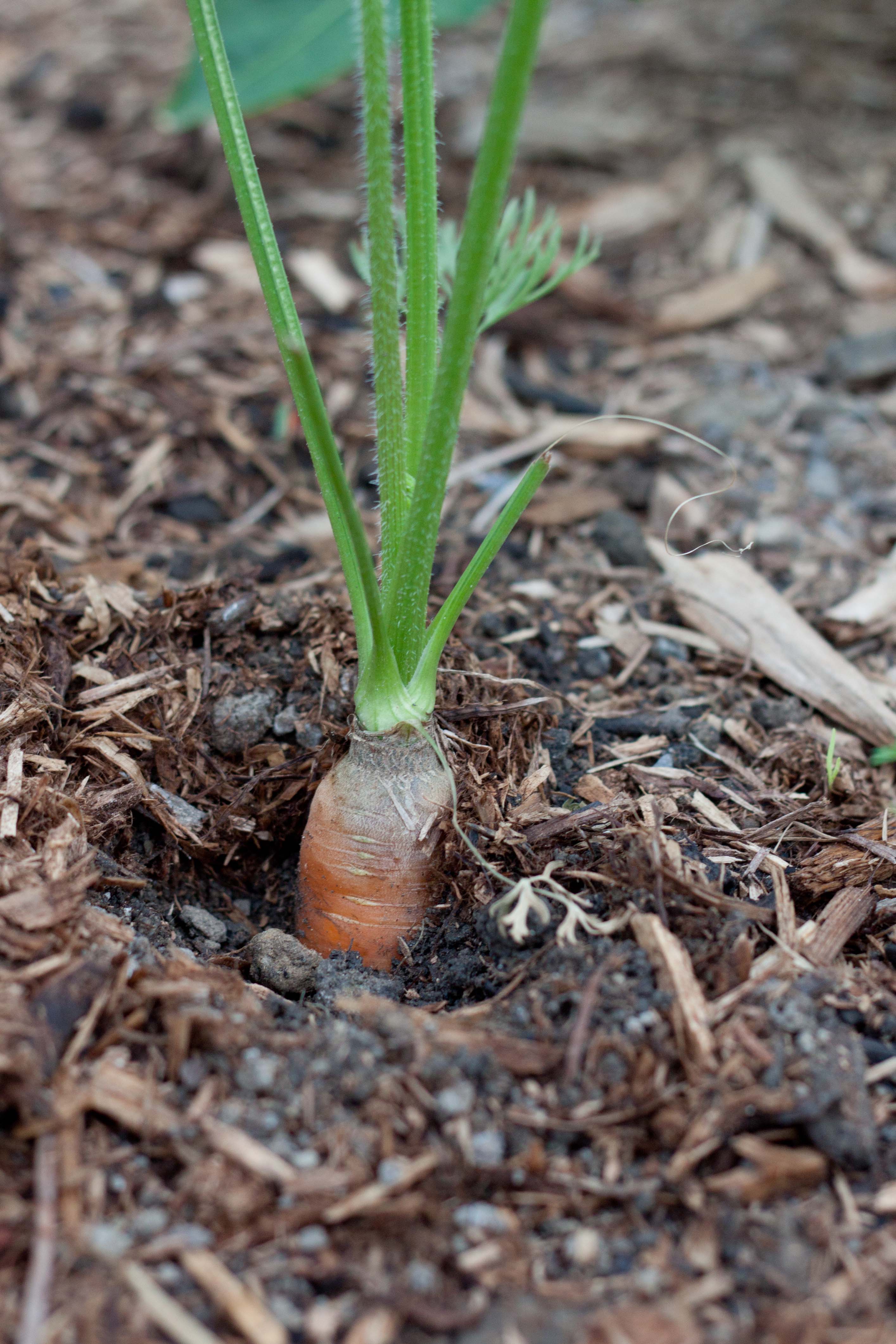 A young red carrot, and an orange carrot, almost read to eat. I pulled one a few days ago, and it was fairly short, so I’ll give this one more time to grow.