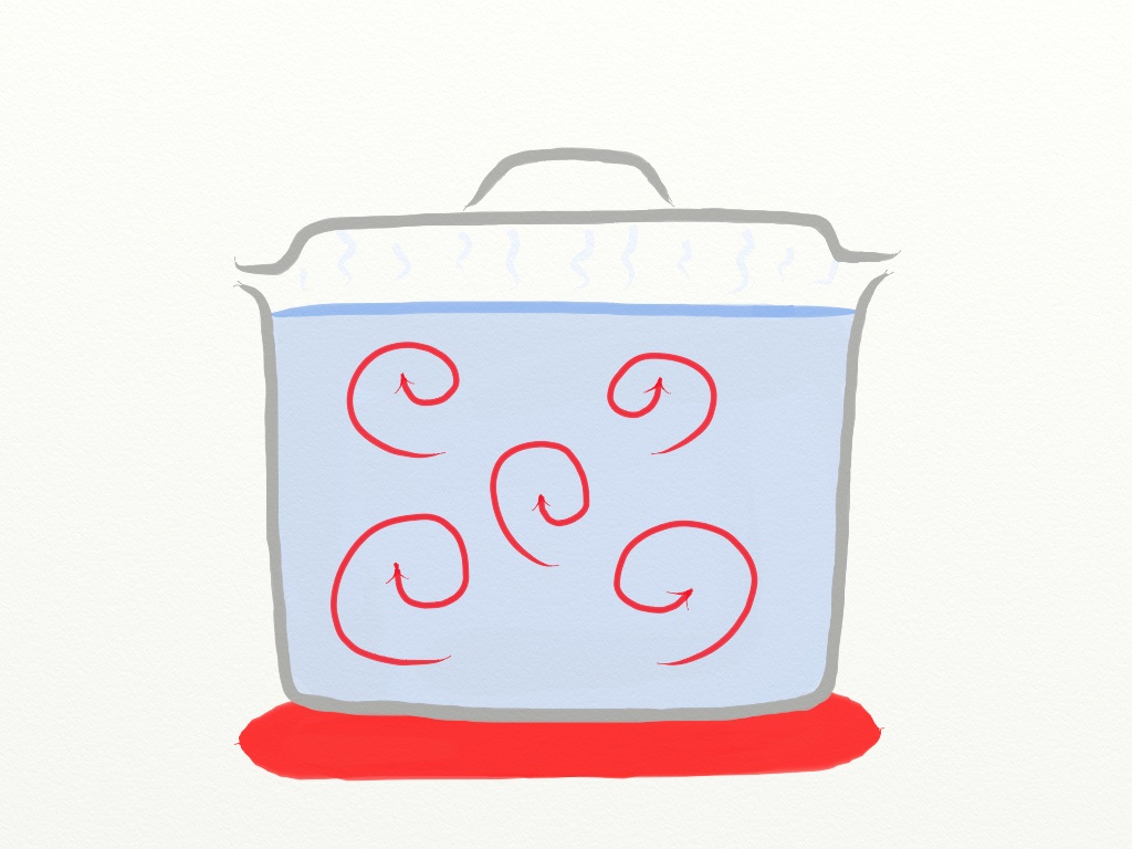 Of course, the submerged objects are also subject to conductive heat transfer (boiled chicken cooks faster than roast chicken, even if the oven is hotter), but the convection makes the cooking much more efficient. A food cooked at a rolling boil (212 Fahrenheit) will cook quicker than food in water just under a boiler (211 Fahrenheit), even though the temperature difference is negligible. That is because the convection, or movement of hot liquid/air results in the food being exposed to more heat. As the hot liquid comes into contact with the cooler food, the liquid is cooled as the heat is transferred into the food. The cooler liquid might just sit around the food, as it is heated by surrounding water and continues to transfer heat to the food. This makes for a longer cooking time. If convection is introduced into the cooking, the liquid is constantly moving, which means the food is in contact with hot liquid the entire time, therefore heat transfer occurs more quickly. This is also true for a convection oven: the hot air is circulated around the food, so the food is in constant contact with hot air, making the cooking more efficient!